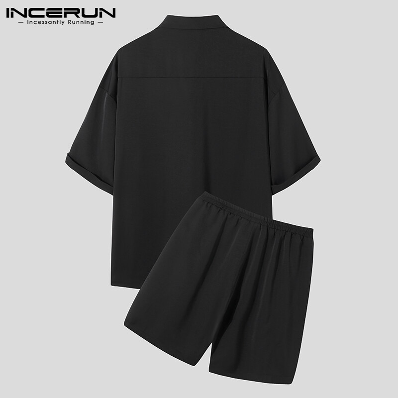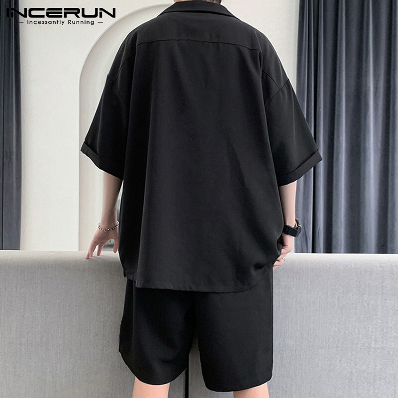 INCERUN男式短袖韩式休闲西装纽扣衬衫弹性腰间短裤套装(韩式)